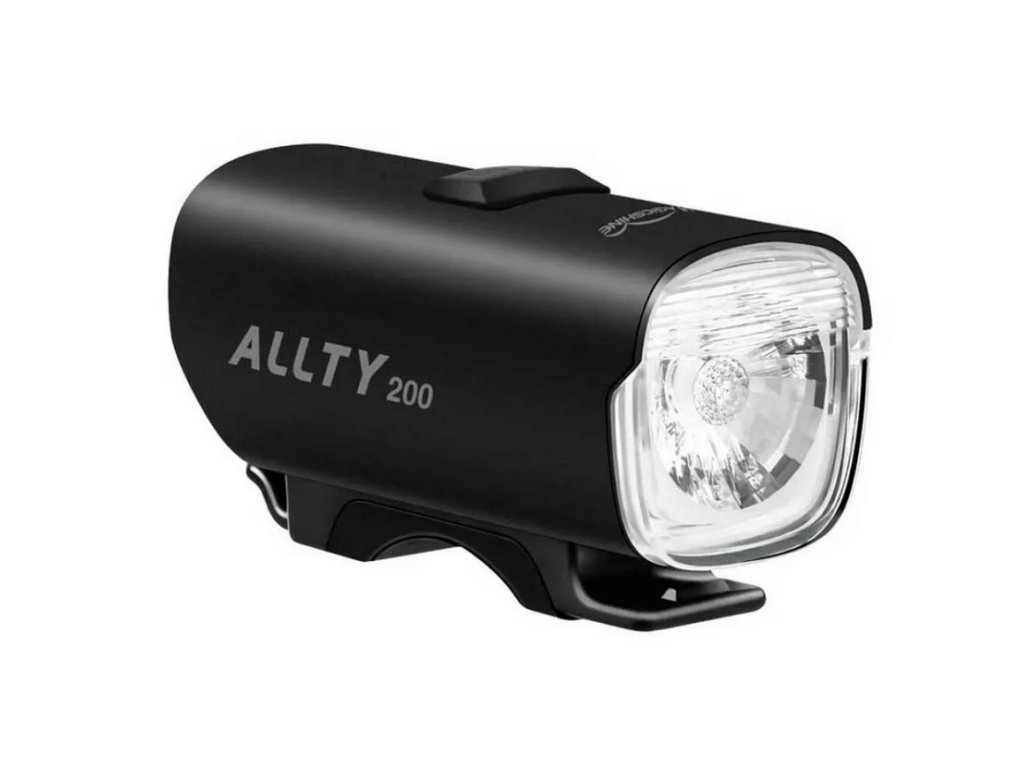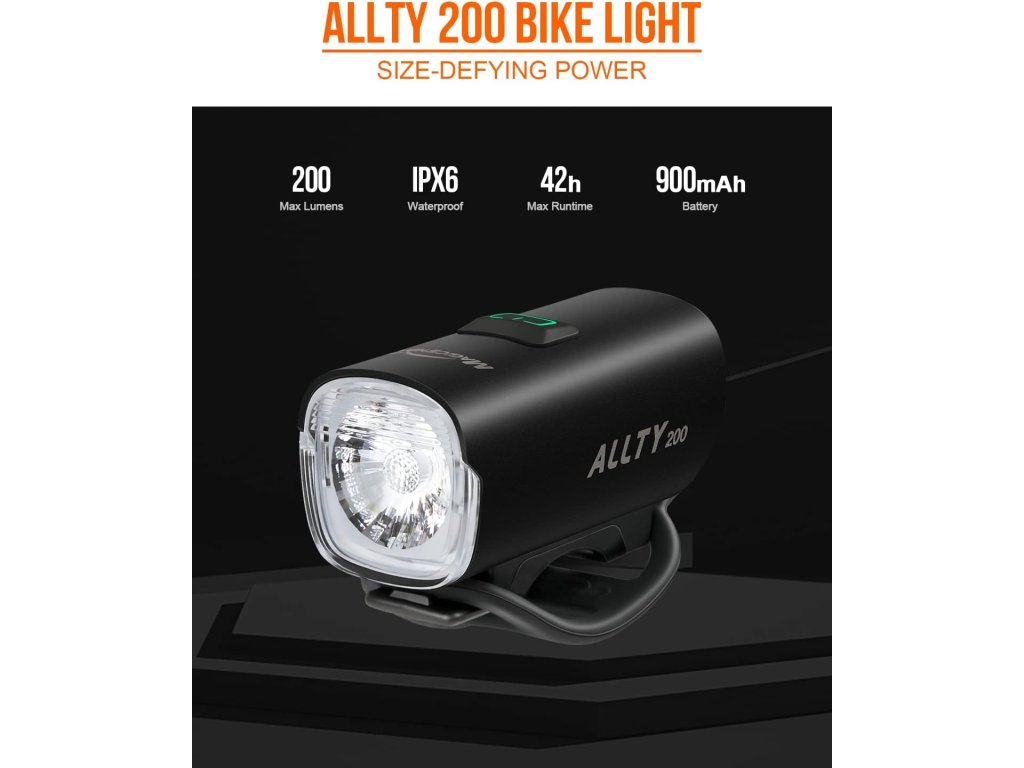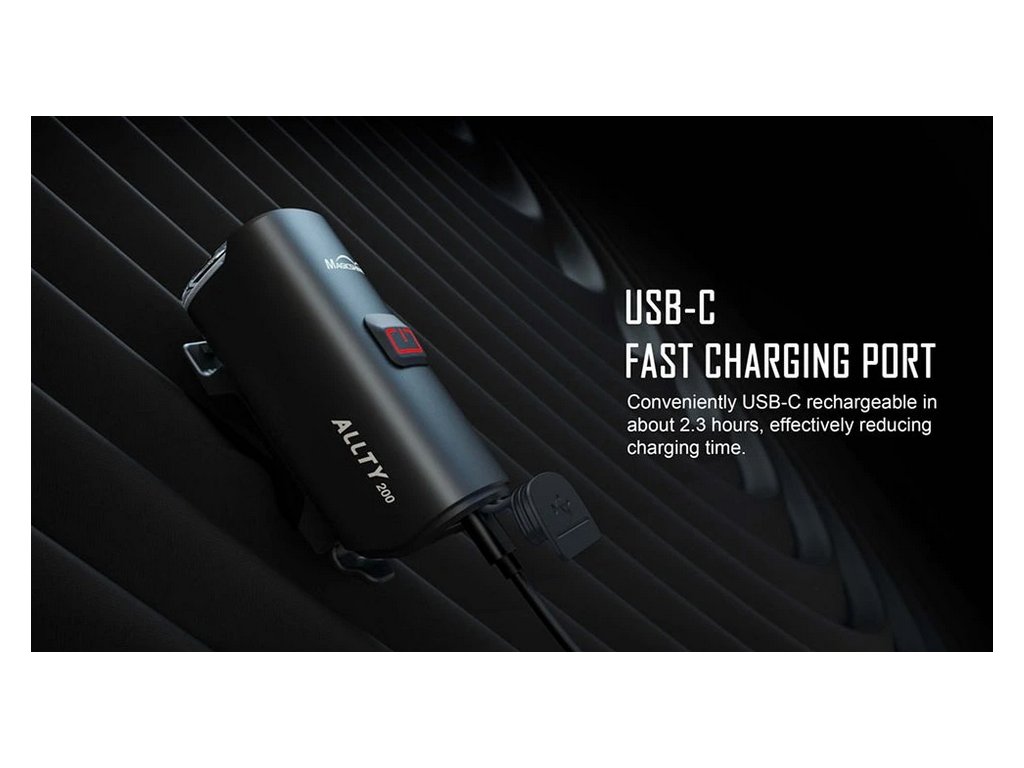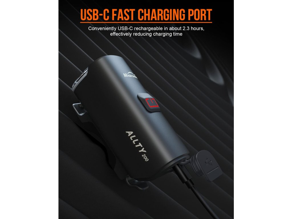 OBSAH BALENIA: svietidlo Magicshine ALLTY 200 USB-C nabíjací kábel silikónová páska na uchytenie na riadidlá