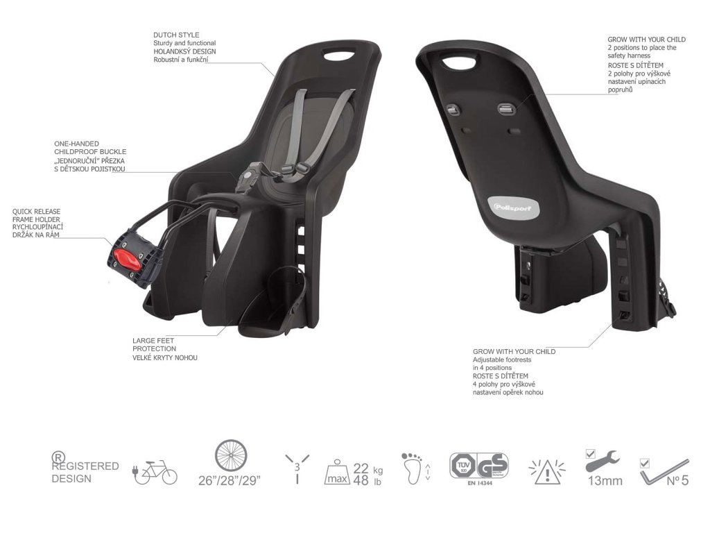 detská sedačka AUTHOR, HOLANDSKÝ DESIGN, robustný a funkčný, 3-bodový upínací popruh pre bezpečné zaistenie dieťaťa, "jednoručná" pracka s detskou poistkou, rastie s dieťaťom – 4 výškové polohy pre nastavenie opierok nôh, 2 výškové polohy pre upínacie popruhy, veľké ochranné kryty nôh, zadný reflexný pruh, hmotnosť dieťaťa 9-22 kg, držiak pre priemer trubky 28-40 mm, testované podľa EN 14344, rozmer sedačky š.412 x v.667 x h.574 mm