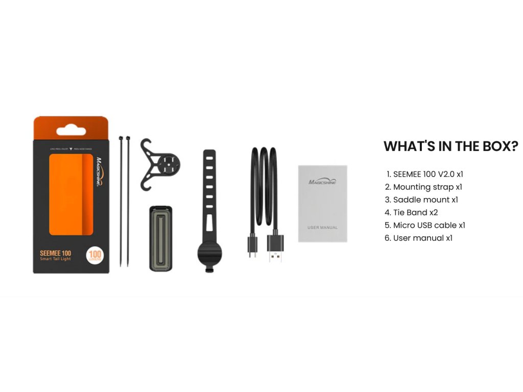 Balenie obsahuje: zadné svetlo SEEMEE 100 V2.0, montážny popruh, držiak na sedlovku, 2 viazacie pásky, USB-C kábel, návod.