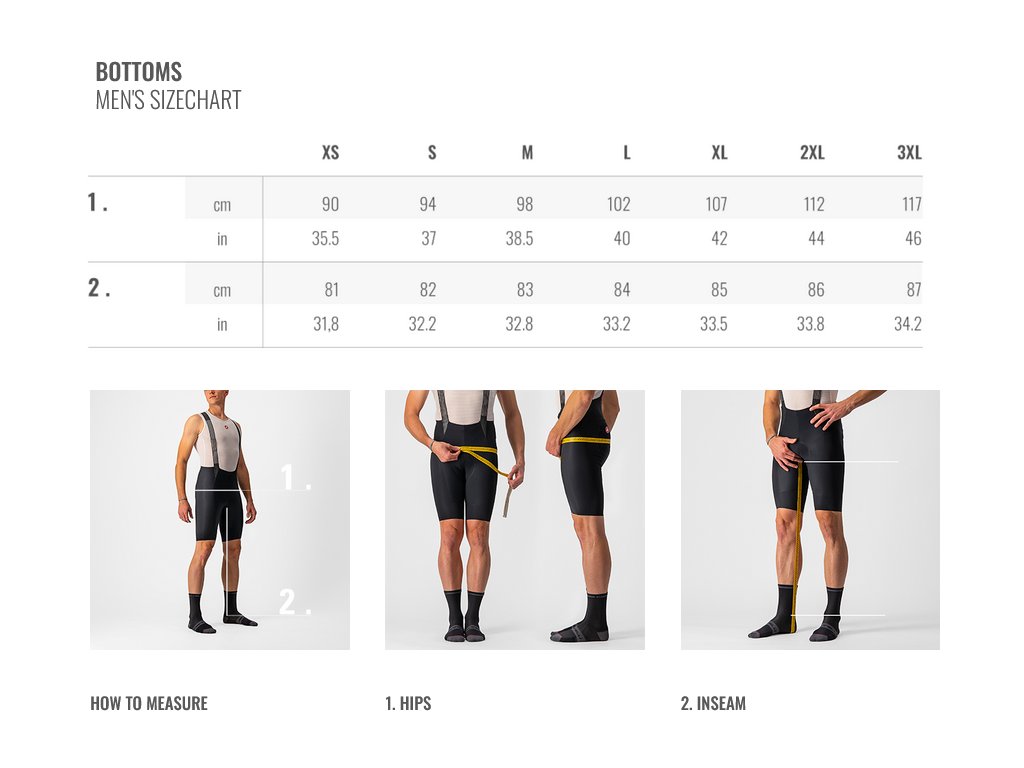 Značka Castelli má neštandartné talianske číslovanie veľkostí - treba vybrať veľkosť minimálne o číslo väčšiu ako bežne nosíte. Venujte prosím pozornosť veľkostnej tabuľke, nech si vyberiete správne a oblečenie vám tak perfektne sadne. Odporúčame porovnať miery s oblečením, ktoré už vlastníte a máte vyskúšané.