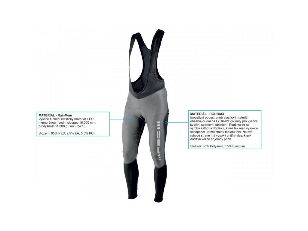 - Vysoko funkčný elastický materiál RainMem s PU membránou (10.000 mm H2O, /11.000 g/m2/24 hr; zloženie: 85% PES, 9,5% EA, 5,5% PU).