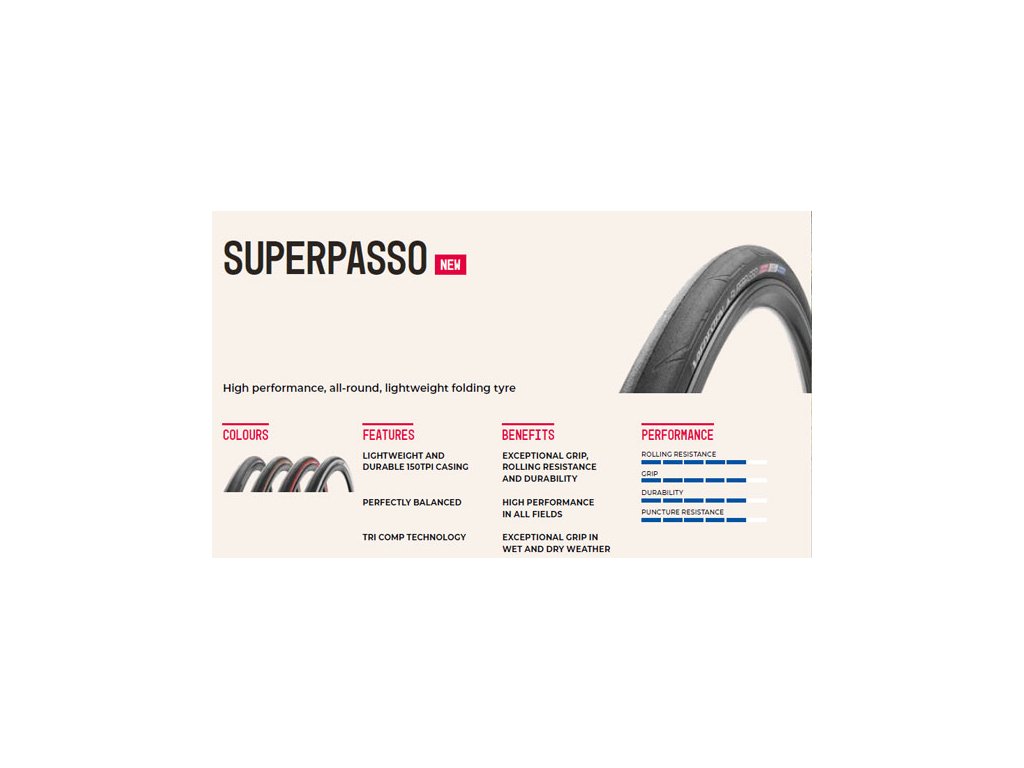 Superpasso je vysokovýkonná všestranná skladacia pneumatika s mnohými funkciami, ktorá vyhovuje širokému spektru jazdcov. Základná konštrukcia s TPI 150, vďaka čomu je pneumatika veľmi pružná, má nízky valivý odpor a poskytuje vysoký komfort pri jazde. Technológia TriComp s vyváženou kombináciou troch zmesí gumy na dezéne a bokoch vám dáva istotu, ktorú môžete očakávať od prémiovej pretekárskej pneumatiky: rovnomerné opotrebovanie, rýchle prejazdy zákrutami, silnú ochranu proti prepichnutiu a maximálna priľnavosť za mokra a sucha.