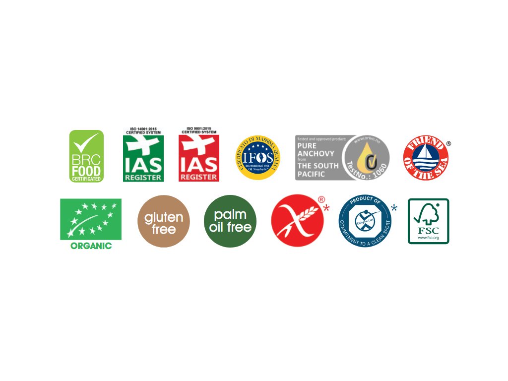 Naše jedinečné skúsenosti nás inšpirujú k objavovaniu nových trhov s istotou, že ponúkame vysoko kvalitné produkty. Od koncepcie až po experimentovanie, od výroby až po komercializáciu, každý produkt je interne sledovaný. Túto pozornosť potvrdzujú aj certifikácie, ktoré sme získali: UNI EN ISO 9001 (pre riadenie kvality), UNI EN ISO 14001 (environmentálny manažment) a BRC (bezpečnosť potravín), IFOS, Friend of the Sea a ORIVO (kvalita a udržateľnosť omega-3 mastných kyselín) a BIO (organický). Taktiež uplatňujeme smernice ISO 26000 pre spoločenskú zodpovednosť našej organizácie.